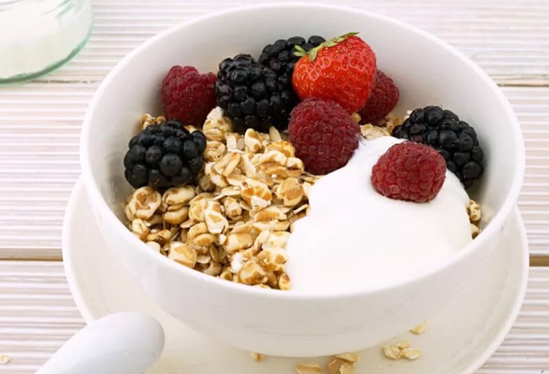 Owoce oczyść i zmiksuj na gładką masę. Płatki nałóż do miski, dodaj odrobinę miodu, jogurtu i musu owocowego. Składniki nakładaj warstwami. Całość posyp cynamonem i ozdób kilkoma malinami i jeżynami.