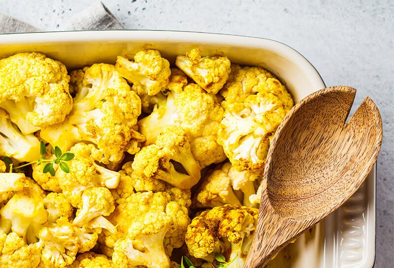 Odciąć liście z kalafiora, przekroić na pół. Główkę kalafiora rozdzielić na różyczki lub pokroić na cząstki. Kalafiora położyć na dużej blaszce wyłożonej papierem do pieczenia. Piekarnik nagrzać do 200 stopni C. Kalafiora polać oliwą, posypać pieprzem, kuminem i czarnuszką, a następnie dokładnie wymieszać i rozłożyć na całej powierzchni blachy. Wstawić do nagrzanego piekarnika i piec przez 30 minut. Po upieczeniu doprawić solą i posiekaną natką pietruszki.