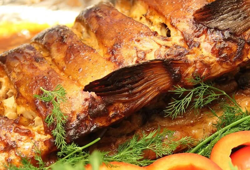 Płaty karpia umyć i osuszyć, pokroić, ułożyć w naczyniu żaroodpornym, nie dodawać tłuszczu, natrzeć przyprawami. Ułożyć rybę skórką do góry, skropić delikatnie oliwą. Piec przez 15 minut w 200 st. do czasu aż skórka będzie miejscami ładnie zrumieniona.