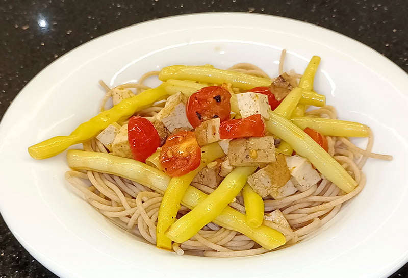 Ugotuj makaron w osolonej wodzie. Fasolkę ugotuj również w małym rondelku w osolonej wodzie. Odcedź wszystko. Pomidorki pokrój w pół. Na oliwie chili podduś tofu (pokrojone w kostkę), pomidorki, dodaj fasolkę i makaron, całość dopraw do smaku.