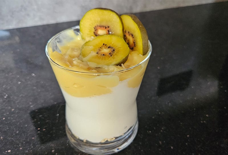 Składniki ułożyć warstwowo według uznania, dodać świeże kiwi na wierzch.