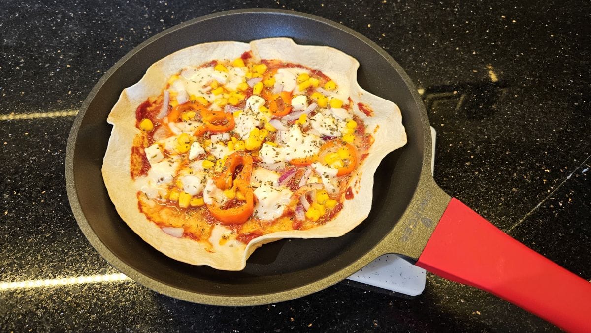 Rozgrzej suchą patelnię, połóż tortillę.Posmaruj sosem pomidorowym.Posyp serem, dodaj warzywa i przyprawy.Przykryj pokrywką i piecz na małym ogniu ok. 7 min, aż ser się rozpuści, a spód będzie chrupiący.