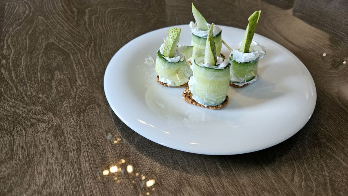 Cienkie paski ogórka rozłóż na desce. Nałóż porcję sera koziego, rozsmaruj. Zwiń w rulon, zabezpiecz wykałaczką. Ustaw na krakersie. Wbij w środek plaster gruszki.